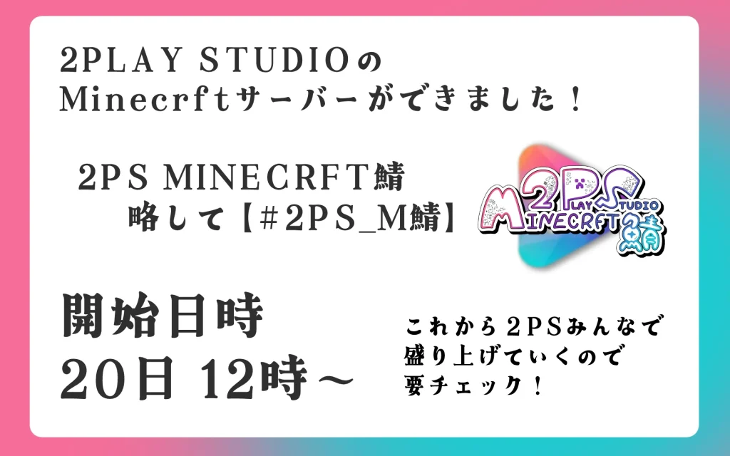 お気に入り追加 ニュース 2PLAY STUDIOマインクラフトサーバー始動! 2PLAY STUDIOのマインクラフトサーバーができました! その名も【2PS MINECRFT鯖】公式タグは #2PS_M です! 事務所所属のメンバーで楽しく遊んでいます。 今日は2PS鯖でマイクラやってた!久しぶりのサバイバルかつノンピースでアホほど死んだけど楽しかった!🪨⛏とろさんが用意してくれた看板と拠点いいでしょ〜!🏠始まって早々に爆発したけどね!!!(オジだった頃のとろさんも見て👀) pic.twitter.com/Pj8zKSc6Oy— 南天まきな (@nanten_makina) September 22, 2025 ぜひ配信見に来てくださいね。 【#2PLAY_STUDIO から嬉しいおしらせ】なんと!2PSのマイクラ鯖ができました!その名も【2PS MINECRFT鯖】公式タグは #2PS_M です!サーバー解放日時は20日 12時~ から!これから盛り上げていくので、よろしくお願いします! pic.twitter.com/xyq4sQXEsS— とろ-106- 1周年感謝🙏✨ (@toro_106_to) September 19, 2025